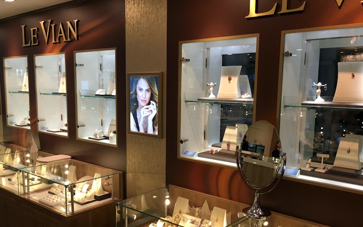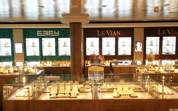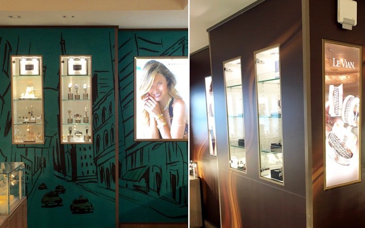 Starboard Cruise Services, always looking to create new experiences onboard, requested to change the look and feel of existing spaces in Jewelry Shops on the Norwegian Cruise Lines Getaway and Breakaway without resorting to new construction. We designed the new EFFY & LEVIAN zone with convenient magnetic, texturized graphic material that allows the transformation of the space quickly and easily.