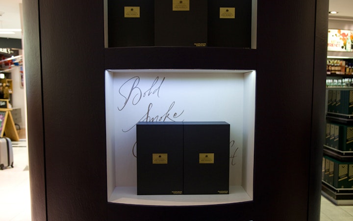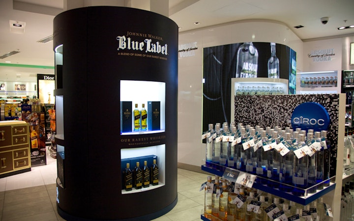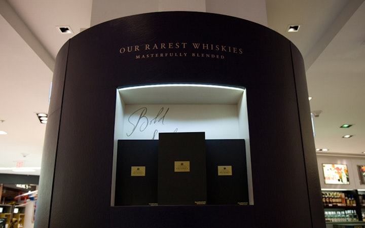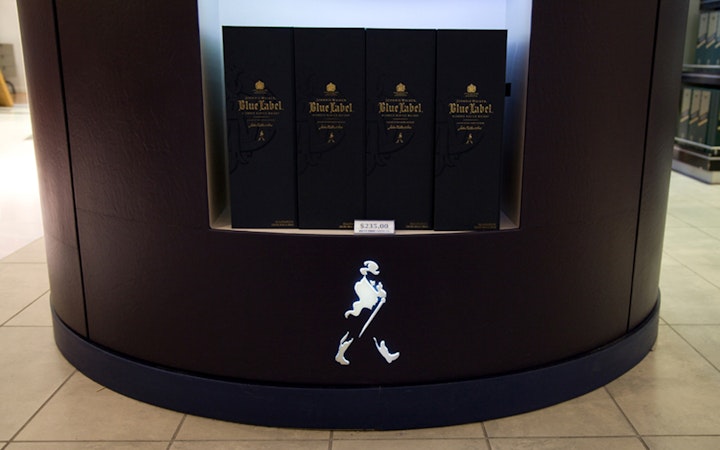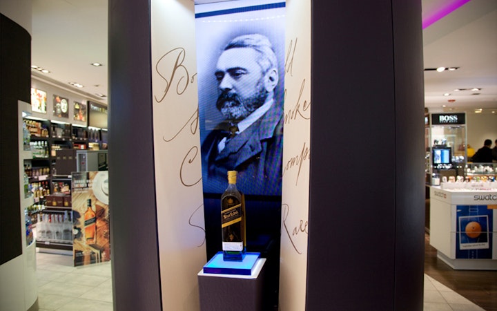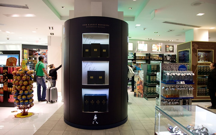 Retail column display created for Johnnie Walker Blue Label and installed at the duty-free shops at Miami International Airport.