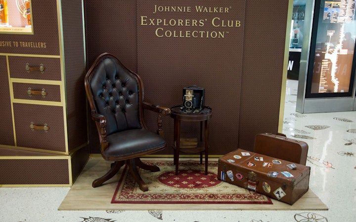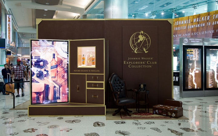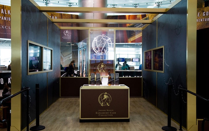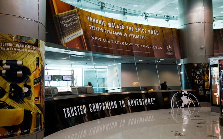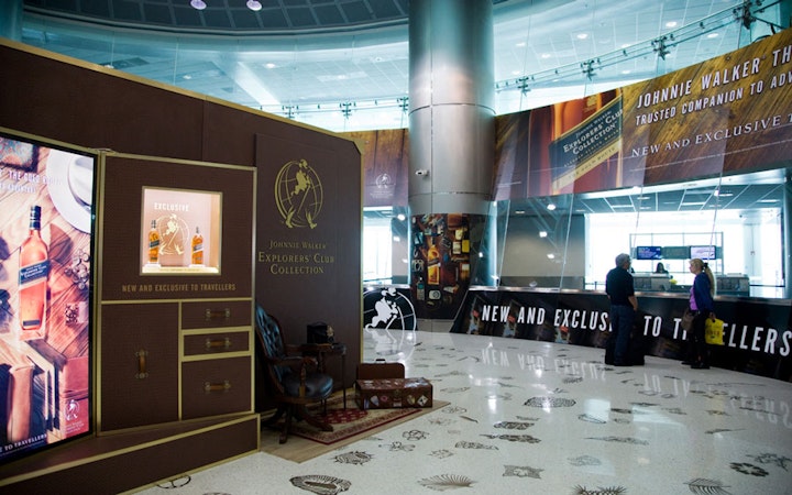 As part of the ongoing campaing for the Johnnie Walker Explorers' Club Collection, we created this design for the entrance of a duty-free store located at the Miami International Airport in Miami. Notice the striding man image above the entrance and the images of bottles of Johnnie Walker on the columns.