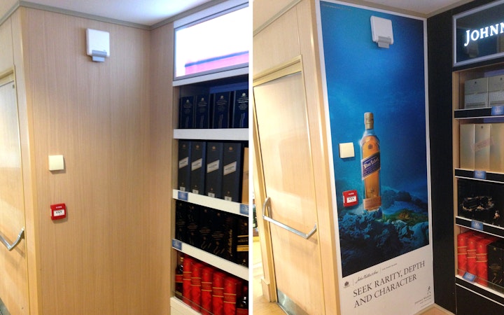 Diageo GTME Western and Starboard Cruise Services wanted to change the look and feel of existing spaces in the Norwegian Cruise Lines Getaway and Breakaway without resorting to new construction. We designed the new Johnnie Walker zone with convenient magnetic, texturized graphic material that allows the transformation of the space quickly and easily.