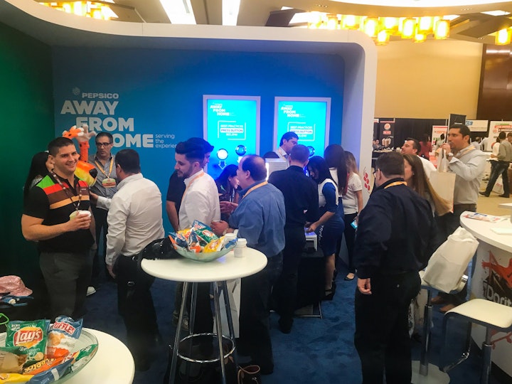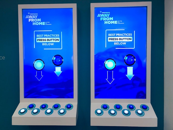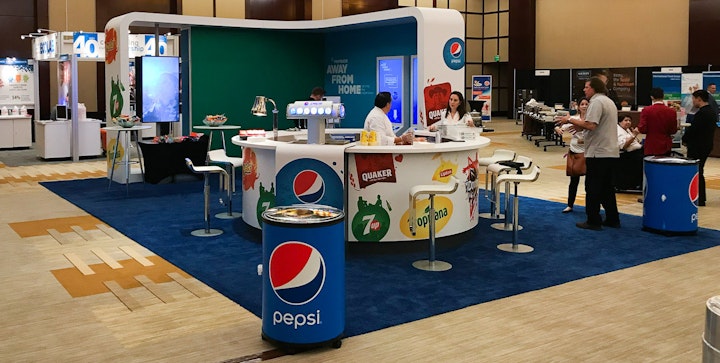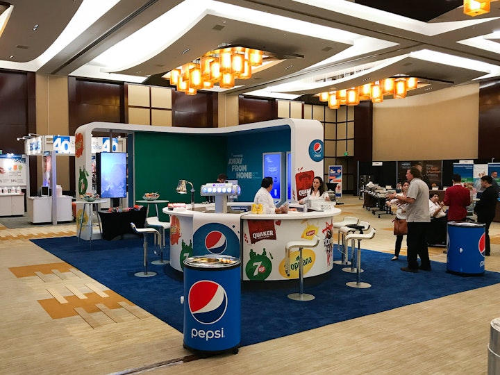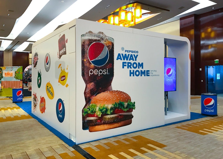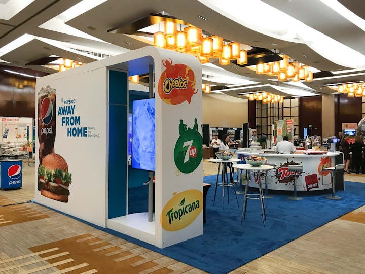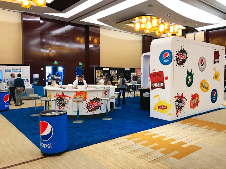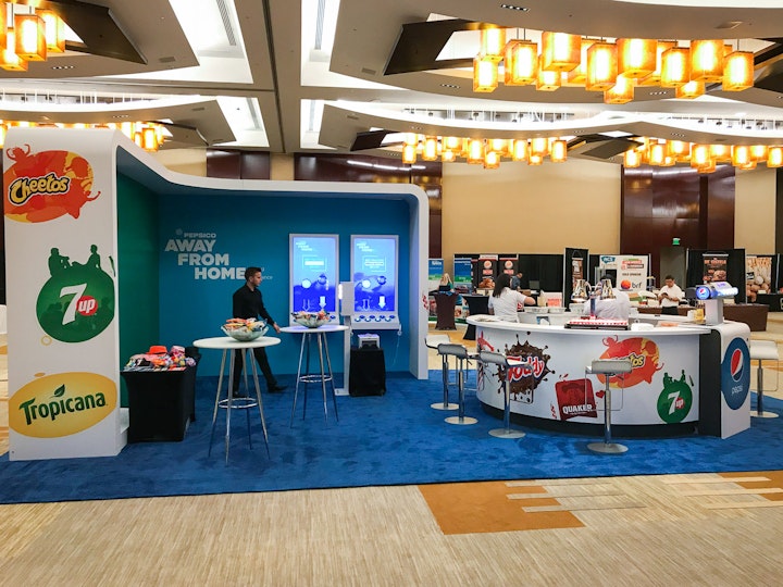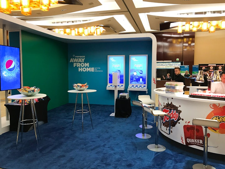Pepsico stand designed and installed at the Burger King Convention. The structure featured three vertical screens; with edited digital content featuring PepsiCo products. Two of the three stations programmed for interactive use showcasing "Best Practices Videos." And a tasting area "bar style" with PepsiCo products.