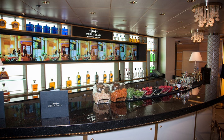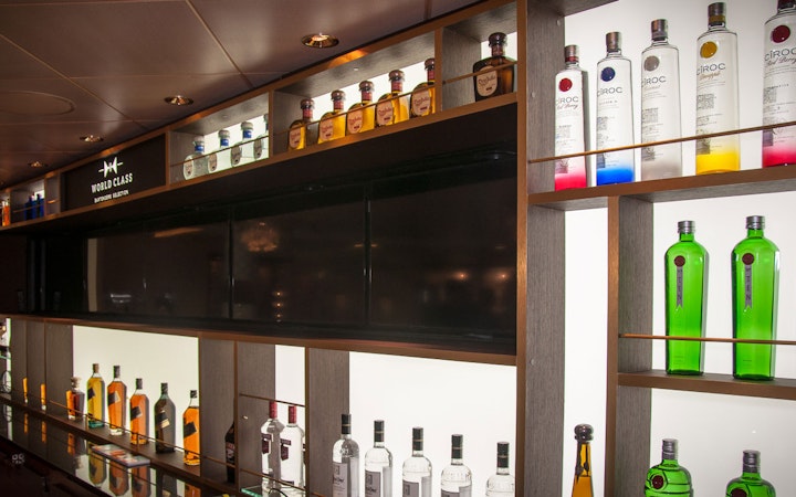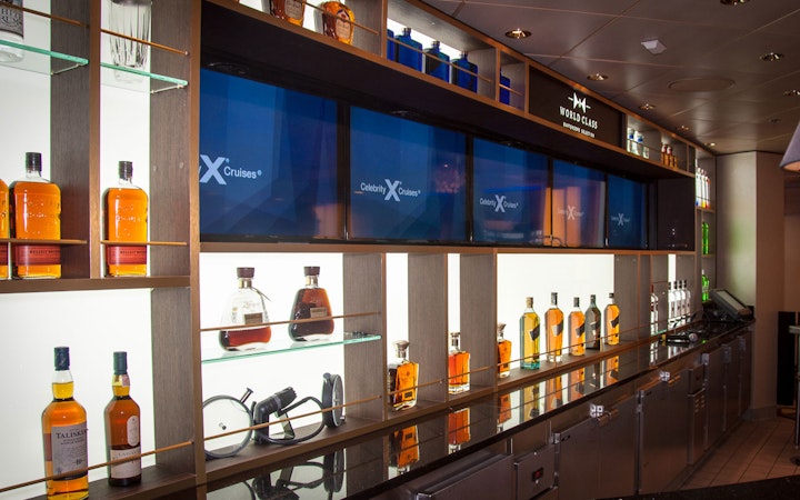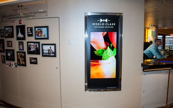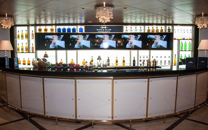 This is the first installation of a Diageo World Class bar in a cruise liner, the Celebrity Eclipse, which travels from Florida to Europe. The project was carried out for Diageo GTME Western and Celebrity Cruise Line. It’s the first of five installations we have lined up in different Celebrity Cruise Line ships. We installed two niches with vertical screens; edited digital content for vertical and horizontal formats; designed, built and installed the back bar wall according to the World Class toolkit and designed, decorated and installed external decorative elements such as side walls, textures and